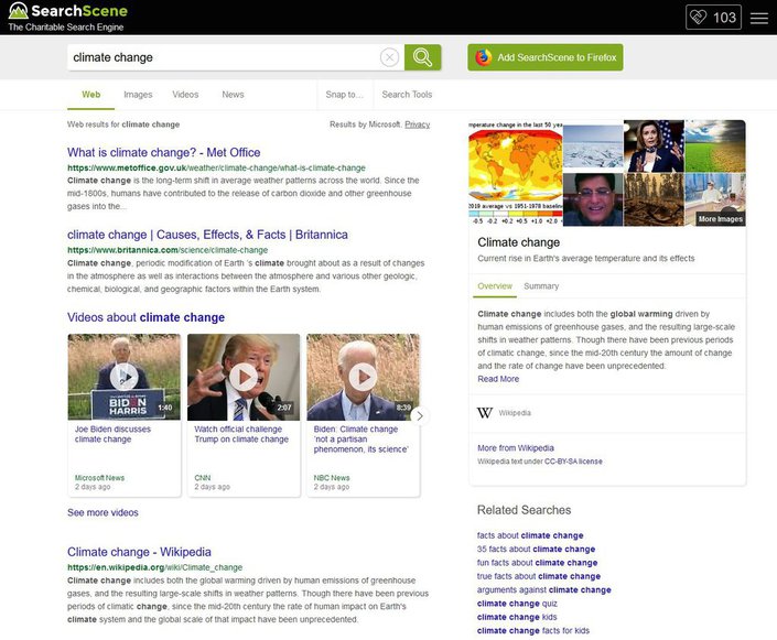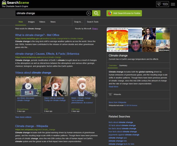 SearchScene is a charitable search engine that donates a big-hearted 95% of its profits to charity, focusing on charities that help fight climate change and alleviate the suffering caused by climate change. SearchScene also respects your privacy! Check out our short video below…
